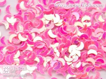 金蔥粉:又名閃光片。包括鋁質金蔥粉,聚酯金蔥粉,幻彩粉,鐳射金蔥粉等。有鋁質,PET,PVC材質。大小規(guī)格(size)由1/256(0、1mm)至1/8(3、0mm)。形狀有六角形,四角形,長條針形和不規(guī)則形狀,并有多種顏色可供選擇。各種材質金蔥粉可不同程度承受高溫(由80*C,180*C,300*C不等) 。