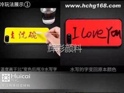 常規(guī)的溫變粉變色溫度為31℃,俗稱手摸變色、手感變色,實際上溫變粉打造出的手機殼的變色條件只是一個區(qū)間,也就是從開始變色到變色結(jié)束的溫度范圍,這個范圍一般為4~6℃。除了遇熱變色外,當(dāng)整體溫度高于某個區(qū)間時,在手機殼上用冷水寫字,也能呈現(xiàn)特別的玩法。