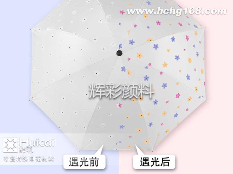 這種加入了感光變色粉的太陽傘在光的照射下變得與眾不同,在千篇一律的太陽傘中激起了一點(diǎn)小小的趣味浪花,為生活增添色彩。科技改變生活,同時(shí)也把我們領(lǐng)進(jìn)一個(gè)全新的社會,變色顏料在各行業(yè)中的應(yīng)用也在不斷改變我們的生活。感光變色粉又稱光變粉、光變顏料、光變色粉等,是使用微膠囊技術(shù)加工制備的光變材料,外觀為粉狀,平均粒徑為3±1 μm,使用簡單,適用性廣,光變粉基本色有十幾種顏色,如葡萄紫、湖藍(lán)色、檸檬黃、樹莓紅等,環(huán)境耐受性和抗光老化性能高。加入光變粉的太陽傘在經(jīng)過陽光/紫外線照射后、產(chǎn)生顏色變化;當(dāng)失去陽光/紫外線后會還原回原本的顏色,從而實(shí)現(xiàn)顏色轉(zhuǎn)變。變色太陽傘就充分運(yùn)用了光變粉的變色原理,在遇光之后實(shí)現(xiàn)從“無色--有色”狀態(tài)的顏色變化。