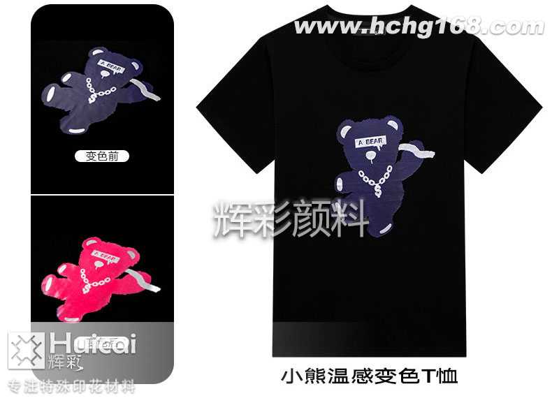 溫變粉在服裝領(lǐng)域的使用工藝為印花工藝,而溫變粉是將有機(jī)微膠囊溫變顏料調(diào)配成原色漿印制或均勻涂在布料上,這非常有趣,當(dāng)衣物所處的環(huán)境溫度達(dá)到條件時(shí),便會給人一種煥然一新的顏色效果。溫變油墨印刷在布料上,可以做成泳褲,當(dāng)人們穿著這樣會變色的泳褲跳入水中游泳時(shí),泳褲遇到冷水,就會立刻變出鮮艷的顏色。