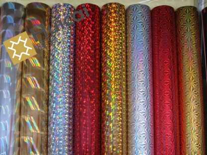 鐳射燙金紙廣泛應用于服裝布料印花、燙印煙盒、酒盒、化妝品盒、禮品、茶盒、臺歷、賀卡等印刷包裝上